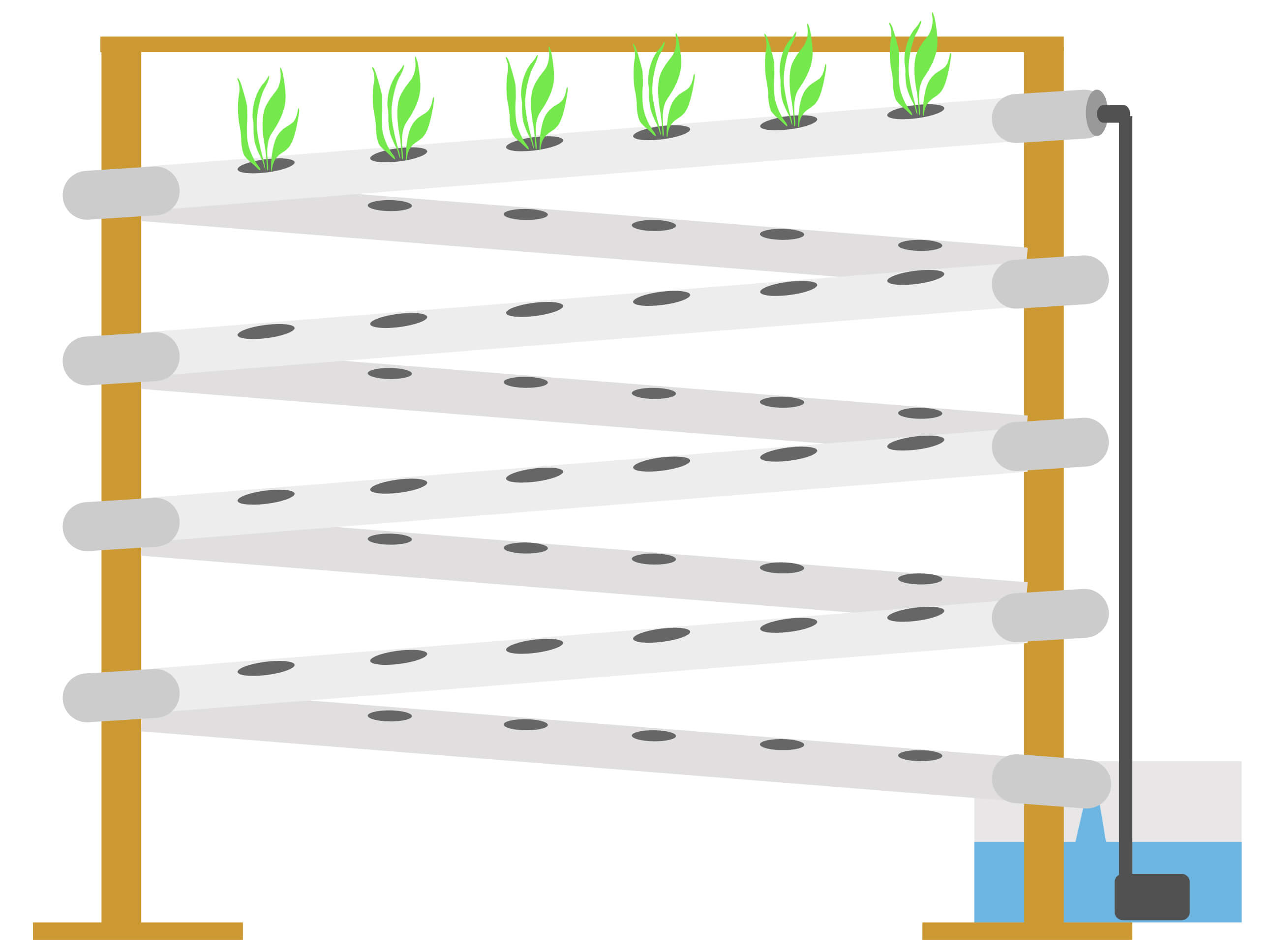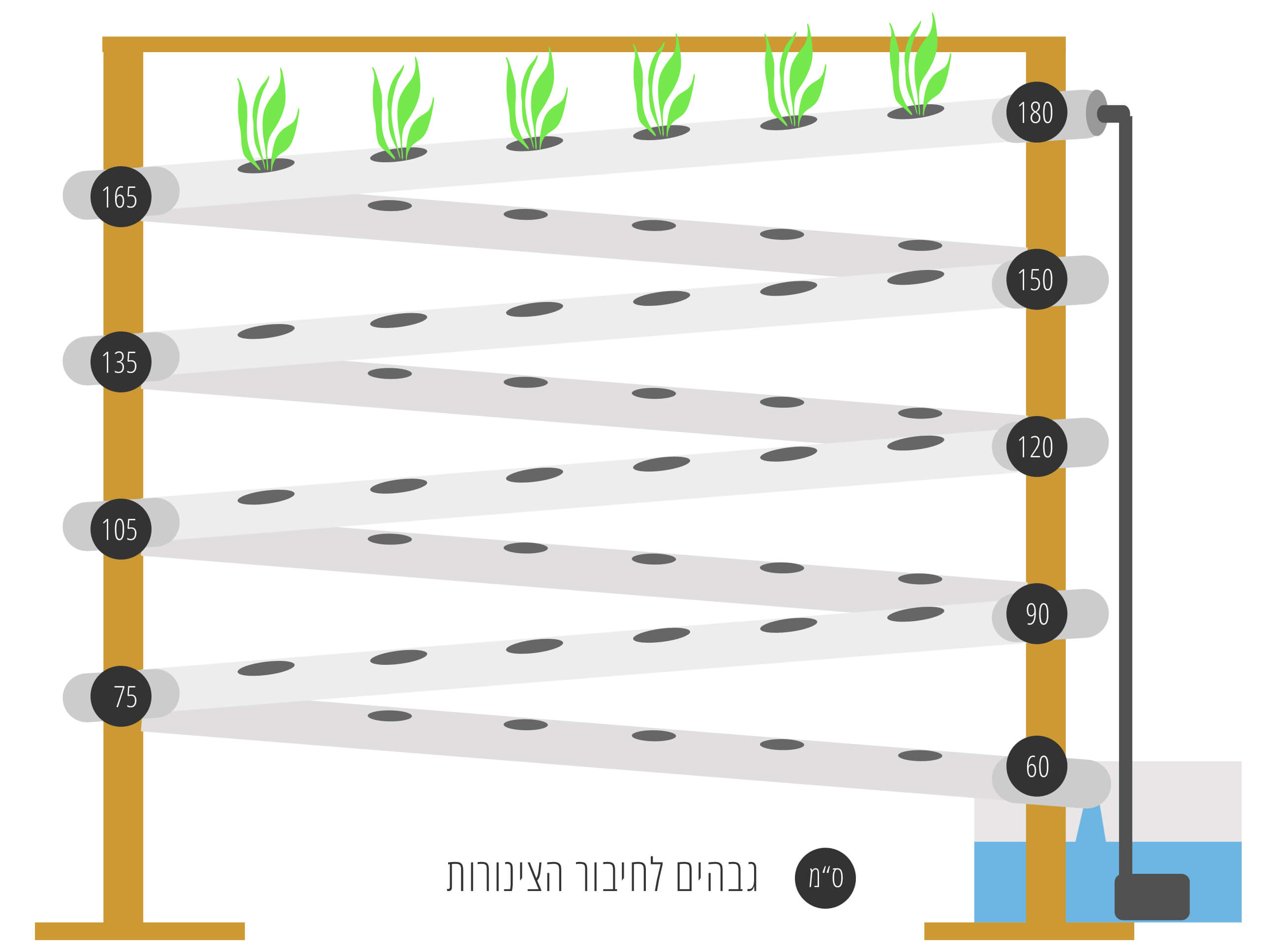 עקרון השיטה עובד באופן הבא: במיכל סגור מתחת לערכה מאוחסנים המים עם הדשנים, המים נדחפים מעלה ע"י משאבה לצינור העליון (כמו בציור), כח הגרויטציה דוחף את המים דרך צינורות הערכה חזרה למיכל וכך חוזר חלילה. הצמחים יושבים בכוסות גידול ושורשיהם ניזונים מהמים הזורמים בצינור. אם בסוף המדריך נותרתם עם שאלות – אתם מוזמנים לשאול אותנו בתגובות ונשמח לענות.