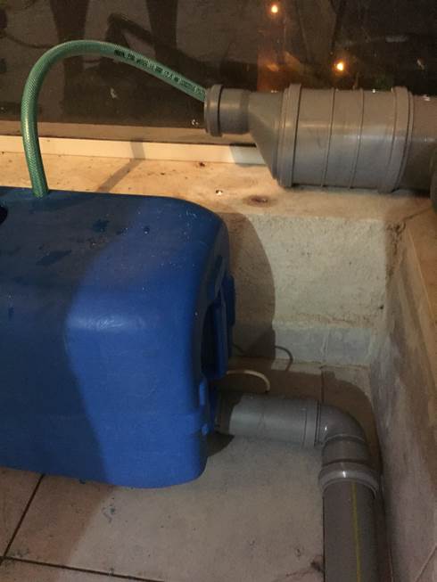את ההרכבה ומילוי המים הראשוני עשיתי כדי לראות שאין נזילות ושהשיפועים תקינים. מסתבר שלגומיות יש כיוון מומלץ (ושאם מרכיבים אותם הפוך אז קשה מאד לפרק אחר כך את שני חלקי הצנרת וזה עלול להוביל לניבולי פה לא ראויים). הרעיון הכללי בתכנון היה לפרוס על המעקה הבנוי צינור 4" ואז בעזרת מעבר מקוטר 4" ל2" ליצור סוג של סכר שניתן על ידי סיבובו לקבוע את מפלס במים בצינור. אל מאגר המים (ג'ריקן של 15 ליטר שבשלב מאוחר יותר הוחלף בחבית פלסטיק של 60 ליטר) שמוקם על רצפת המרפסת, חובר צינור ה 2" ובתוכו ישבה המשאבה הטבולה ( eBay) שהזרימה מים חזרה לצינור הרחב.