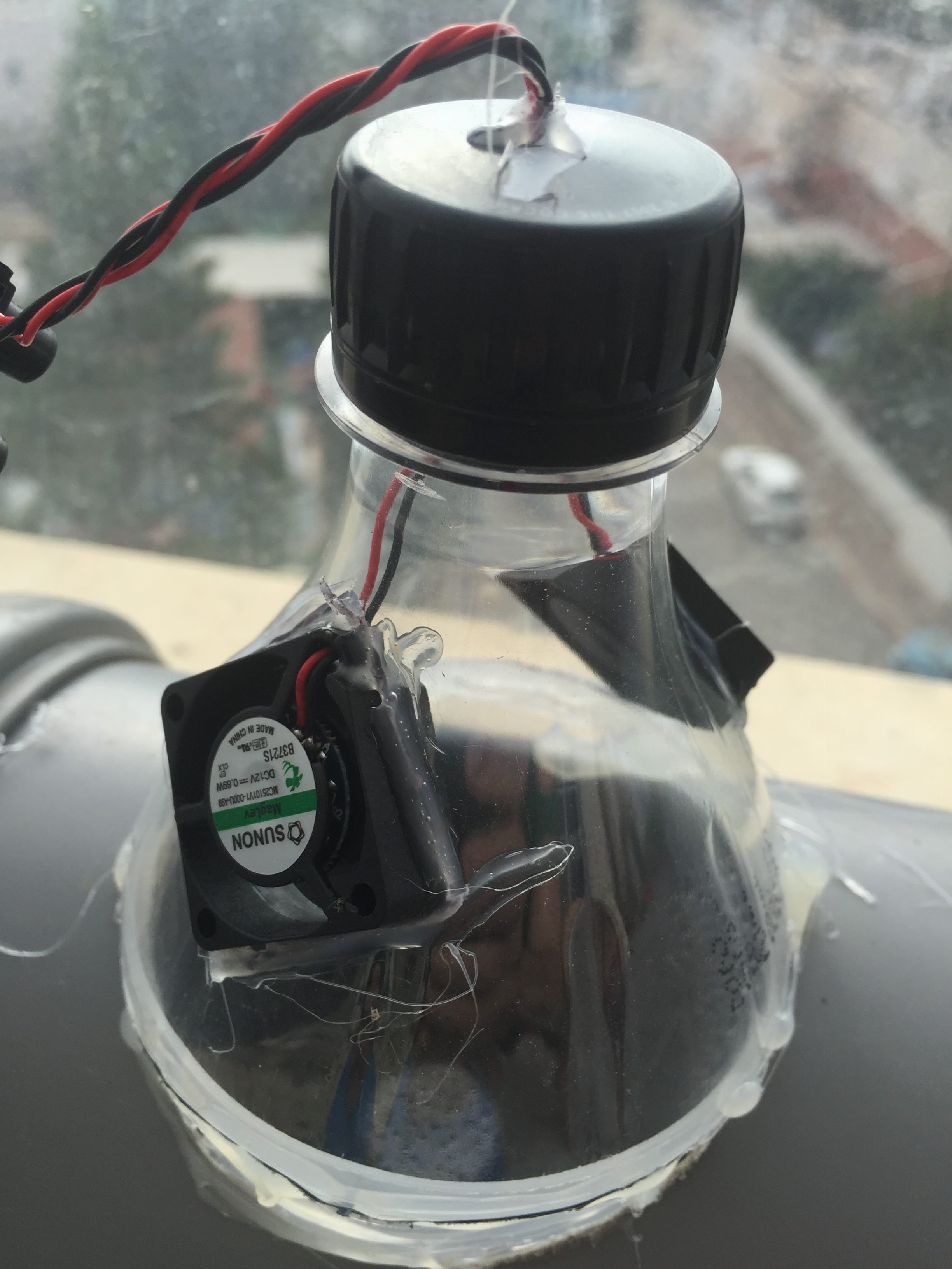גם המיכל שהיה חשוף לקרינת שמש ישירה היה חם מאד. בשעות הצהריים הטמפרטורות היו מטפסות לכיוון ה 32 מעלות. ברור שזה רחוק מאידיאלי. ככל שהמים חמים יותר רמת המסיסות של פחמן דו חמצני במים יורדת וכך גם היכולת של השורשים לשרוד. חוץ מהפרחים והריחן שעשו רושם שהחום והשמש עושים להם טוב כל שאר הצמחים נראו חולים. בשלב הראשון ניסיתי לבודד את הג'ריקן והכנסתי אותו לתיק שומר חום/קור שהקריב את חייו לטובת המטרה ומיקמתי שימשייה מעליו כדי למנוע את הקרינה הישירה. זה לא ממש עזר כי בסוף היום עדיין המים היו חמים. אחד הדרכים לקרר מים הוא על ידי אידוי, אז הרכבתי משני מאווררי מחשב וספק 12 וולט מעיין "משאבת אידוי" שחוץ מרעש לא ממש דגדגה את המערכת, ובשלב די מוקדם הפסיקה לעבוד ( כנראה בגלל תנאי האבק והלחות שהמאווררים האלה לא מותאמים לעבוד בהם ).