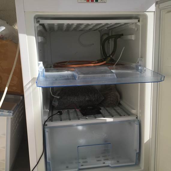 בדיקה ברשת העלתה שמערכת קירור ייעודית עם בקרת טמפ' עולה כ 2500 ₪ שממש לא התאים לי להוציא. אי לכך פצחתי בחיפוש אחרי אלטרנטיבות מכיוונים זולים יותר. ניסיתי לפרק ולהשמיש מערכת בר מים ביתי שאחד השכנים זרק אבל אחרי פירוק מהנה הסתברה סיבת ההשלכה של הבר מינן – המדחס לא עובד… בסופו של דבר מצאתי ביד 2 מקפיא קטן למכירה ותמורת 400 ₪ הפכתי לבעליו החוקי. אני מודה שהיססתי לפני שקדחתי בו שני חורים מכוערים בדופן, אבל המטרה מקדשת את האמצעים… הניסיון הראשון כלל העברת צינור המים שיצא מהמשאבה דרך החלל של המקפיא בתוך כלי מלא מים ומשם חזרה אל המערכת. העובדה שהמים בכלי לא קפאו העידה על כך שחום אכן עובר דרך הדופן של הצינור וזה אומר שהמים מתקררים, בפועל המים עדיין היו סביב ה 27 מעלות. עשיתי ניסיון לשפר את היעילות של מעבר החום וקניתי שני מטר של צינור נחושת שגולגל לסליל שדרכו זרמו המים אבל גם זה לא עשה רושם משמעותי על הטמפ". לא אלאה אתכם בכל הנוסחאות והחישובים, אבל בשורה בתחתונה ההספק שמפיק מקפיא בייתי מתוכנן לעבוד מעולה על שמירה של טמפ' נמוכה של תא סגור ומבודד היטב, זה הספק נמוך בהרבה מההספק הדרוש כדי לצנן כמות כזו של מים שמסוחררים במערכת פתוחה וטמפ' סביבה של 38 מעלות בצל. בפועל הבנתי שאין ברירה וצריך לחכות לסתיו…